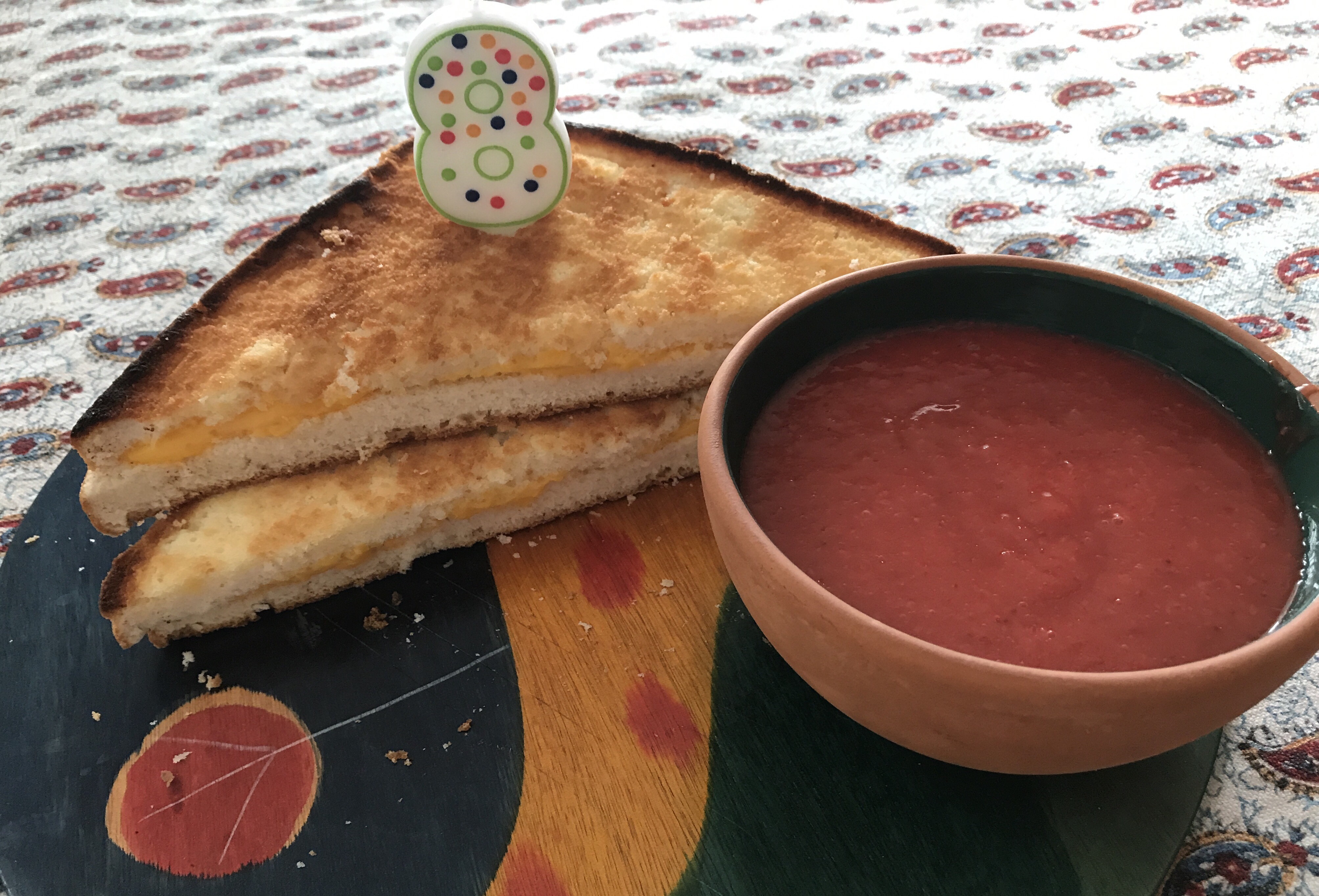 Grilled cheese cake with strawberry-mango “tomato” soup