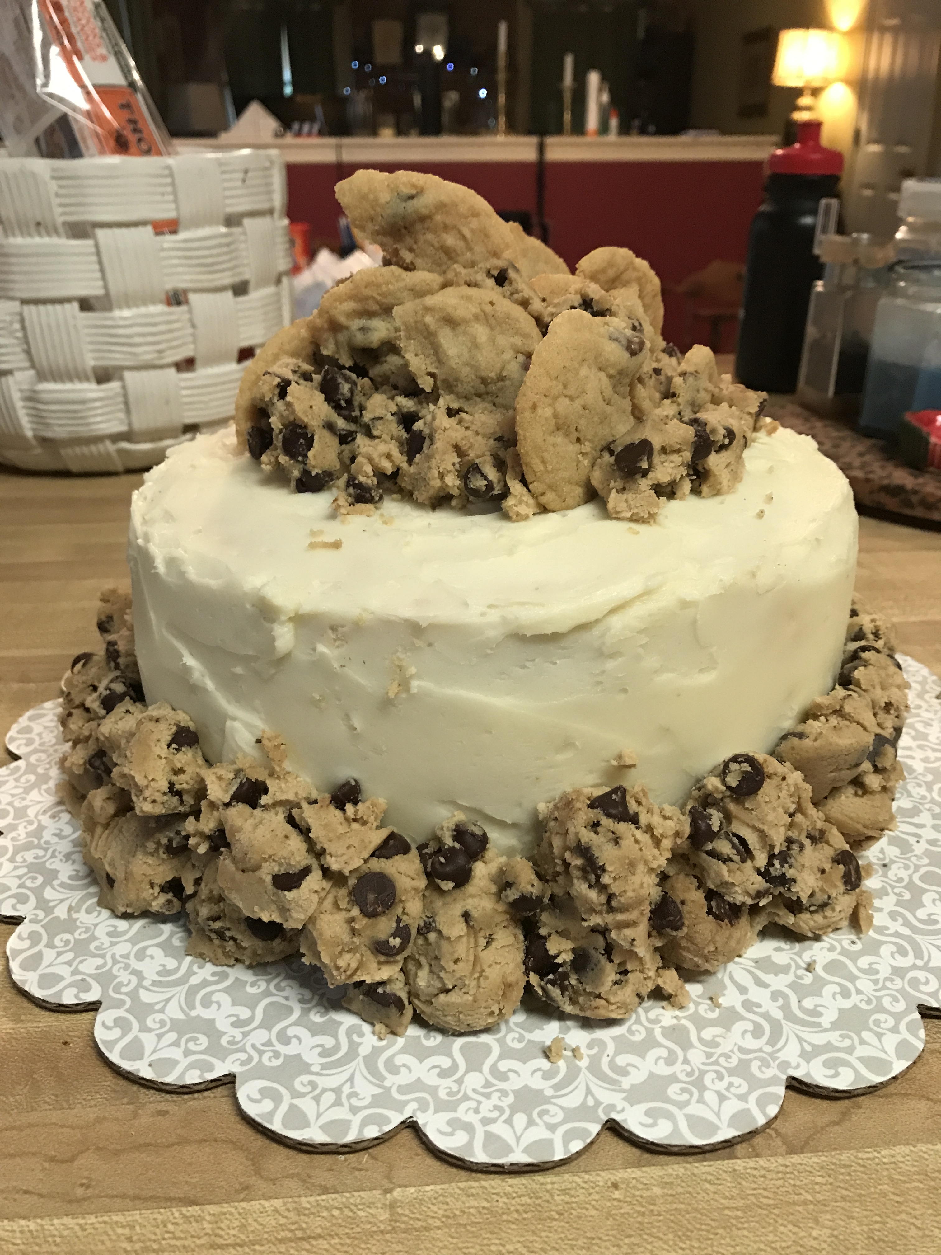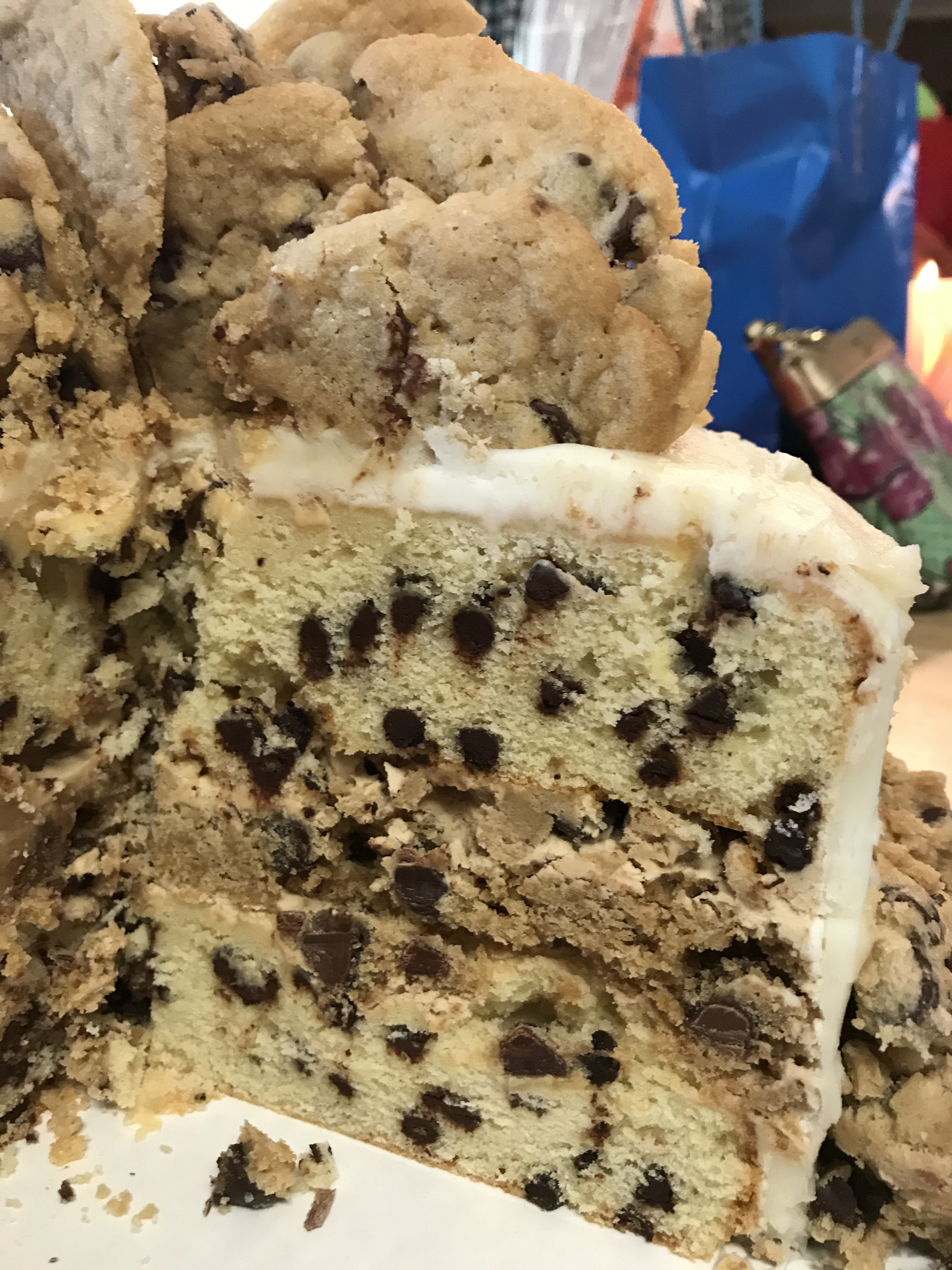A chocolate chip cookie dough cake inspired by Howtocakeit.com‘s Cookie Dough Mega Cake