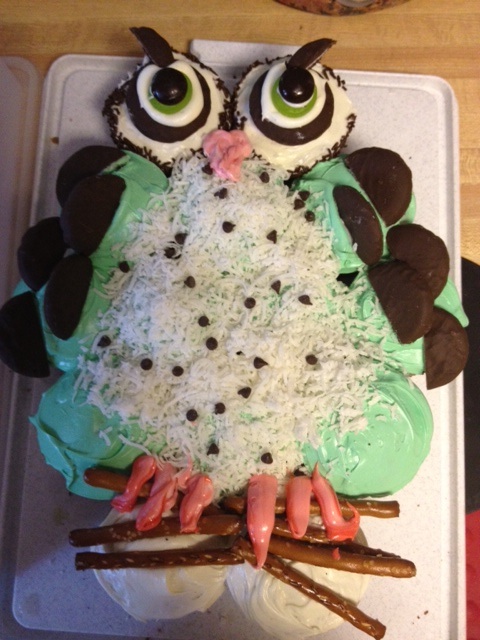 Arielle is interning at a bird rescue center, so I made her the owl birthday cake from Family Fun Magazine